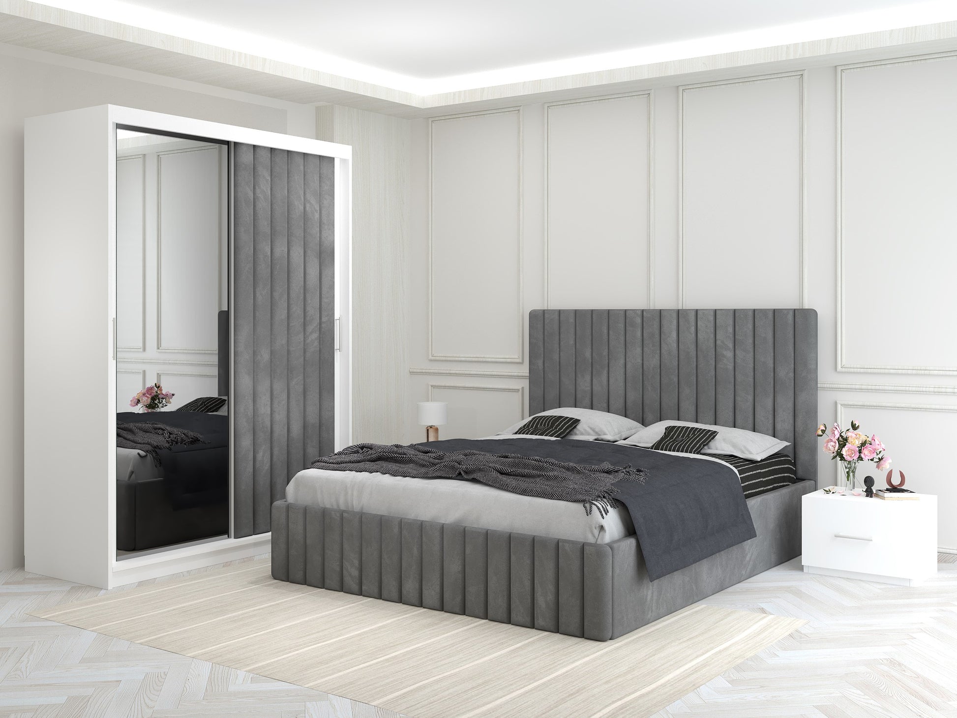 Dormitor Melania – Pat Tapițat cu 2 Noptiere + Dressing Tapițat cu Oglindă