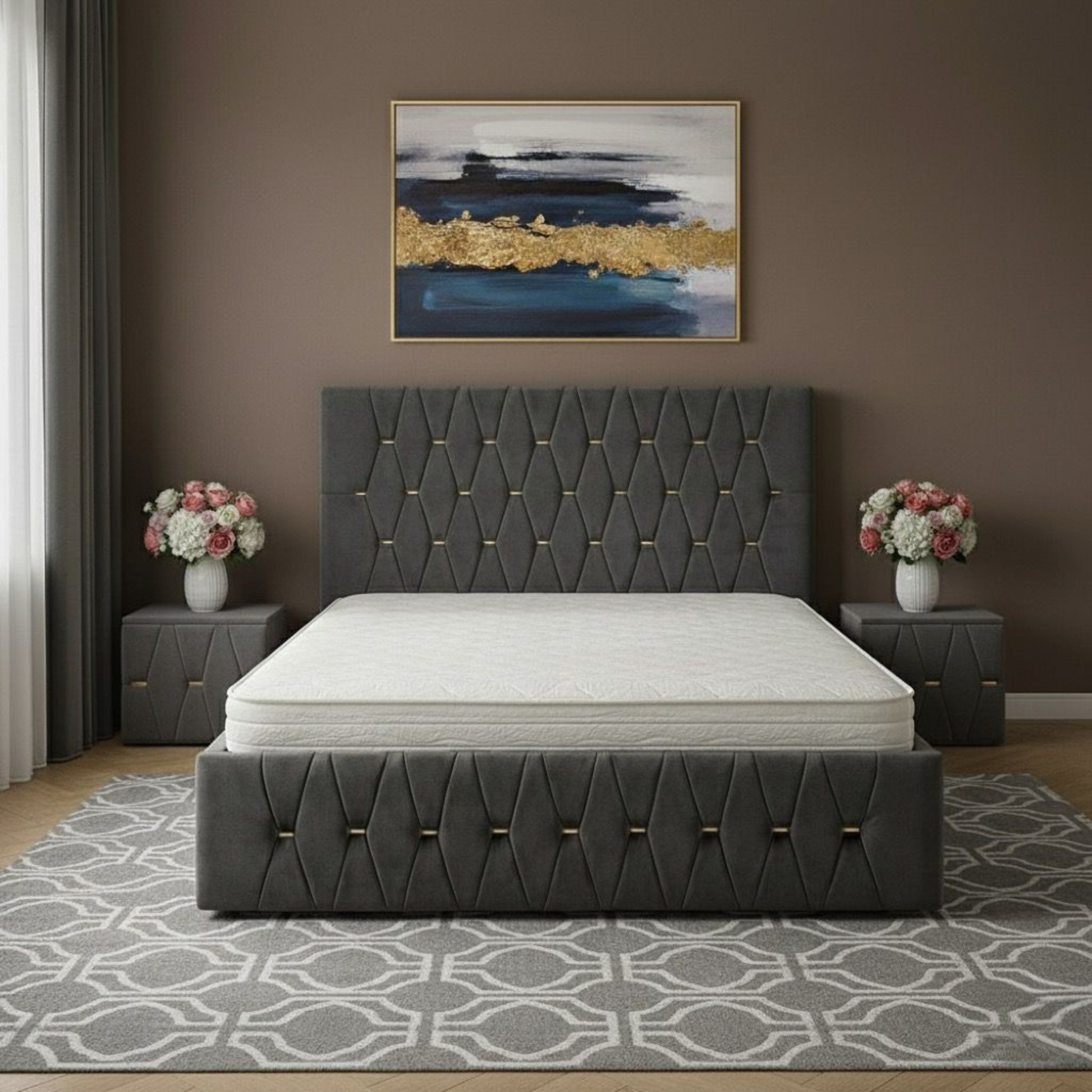 🔸 2 noptiere tapițate incluse – oferă simetrie și funcționalitate, perfecte pentru depozitarea obiectelor de zi cu zi